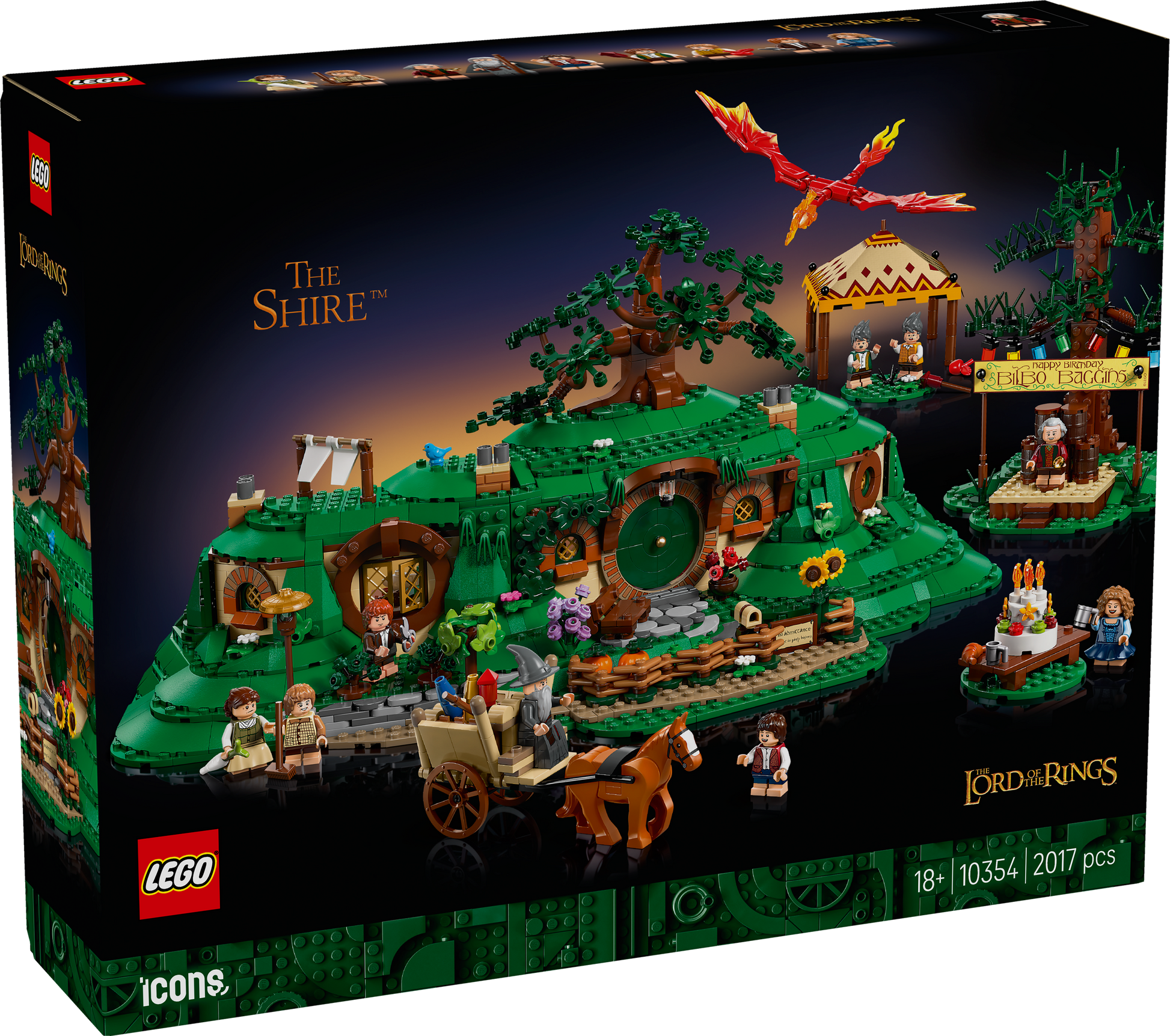 Journey to Middle-earth™ with the LEGO® Icons The Lord of the Rings: The Shire™ (10354) film memorabilia set. Bursting with features that fans will adore, this intricate diorama captures the magic of Bilbo Baggins’ eleventy-first birthday party and includes 9 film characters: Bilbo Baggins™, Frodo™, Mrs. Proudfoot, Farmer Proudfoot, Merry, Pippin, Rosie, Samwise™ and Gandalf the Grey™. Recreate Bilbo’s hillside hobbit hole, complete with a round door and a richly furnished interior, including an entrance hall, study and parlour. Bring scenes to life with interactive functions. Transform a burning letter into The One Ring™ or make Bilbo vanish at the turn of a dial. Packed with film details, from Gandalf’s horse and cart to the firework dragon and Party Tree, this set makes an enchanting display for the home or office. Discover the inspiring range of LEGO building sets for adults. The LEGO Builder app features a digital version of the building instructions included with this set.