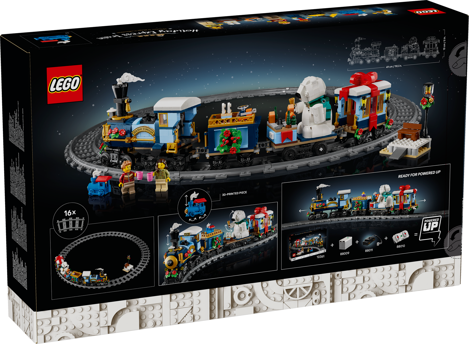 The LEGO® Icons Holiday Express Train (10361) model train set has arrived. Craft a locomotive with a bobbing chimney, coal tender, flat wagon carrying a bell-ringing polar bear and an end carriage with a furnished interior. This adult building kit also includes 4 minifigures and a passenger platform with a bench and lamppost, plus miniature toys including, for the first time in a retail LEGO set, a 3D-printed train piece. Build the track around your Christmas tree and add the LEGO Powered Up kit (sold separately) to motorise the locomotive.