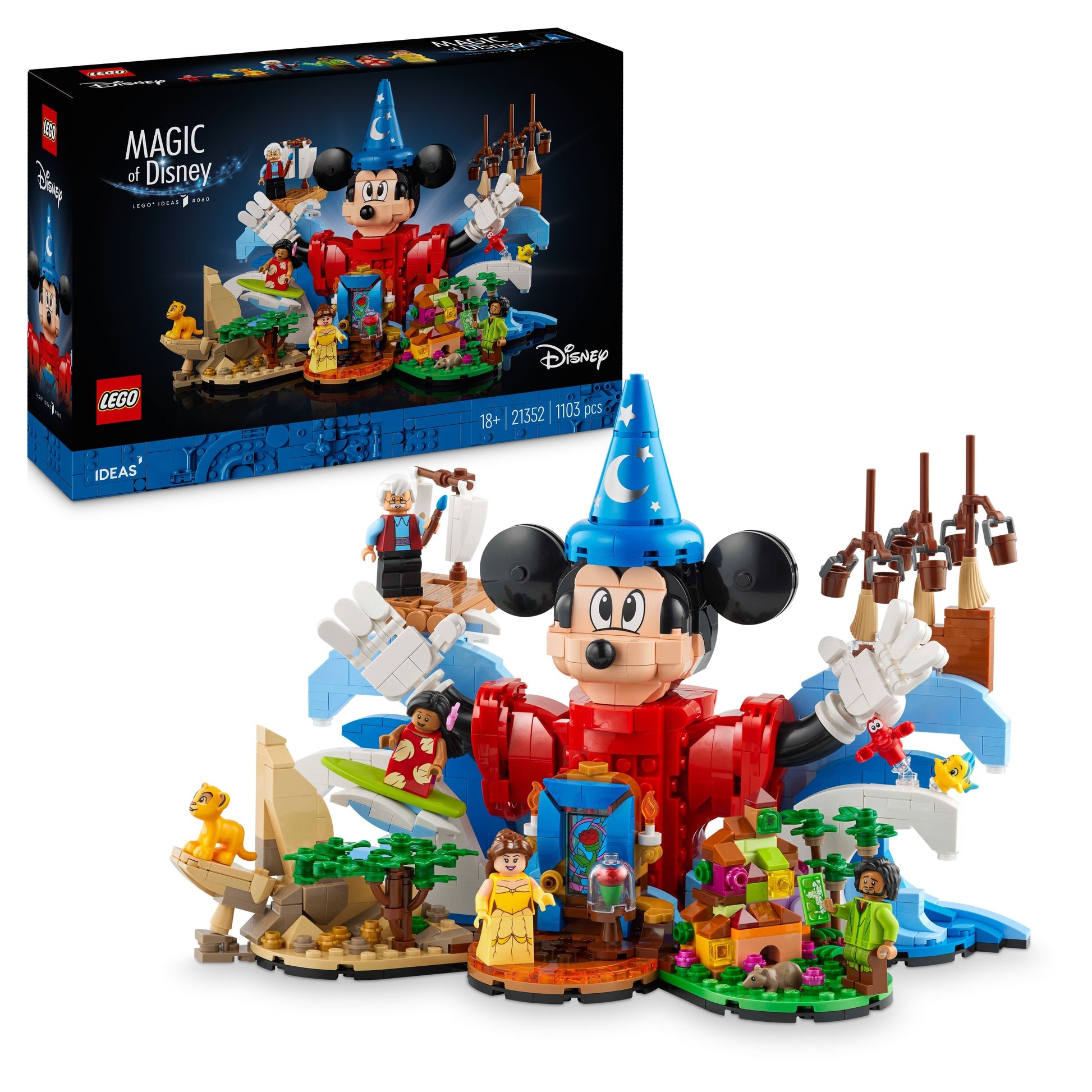 Iconic Disney characters – A buildable Mickey Mouse figure, Belle, Geppetto, Bruno and Lilo minifigures, plus Simba, Sebastian, Flounder and 3 Broom figures